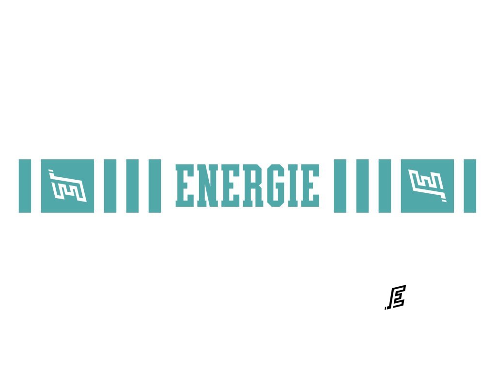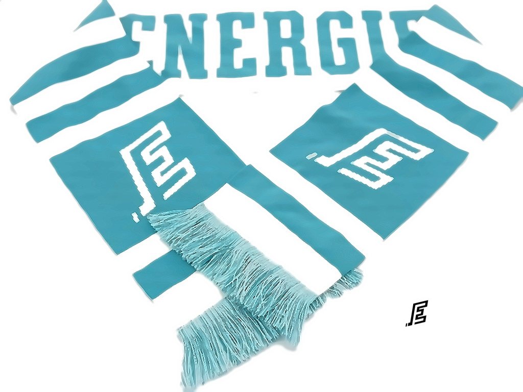 Weiß-türkisfarbener Schal HC Energie für die Saison 25–26. Beidseitiges Design mit den Aufschriften ENERGIE und #VEVARU.