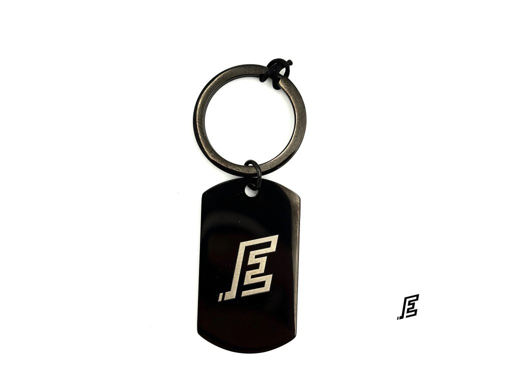 Schwarzer Schlüsselanhänger aus Edelstahl mit graviertem E-Logo