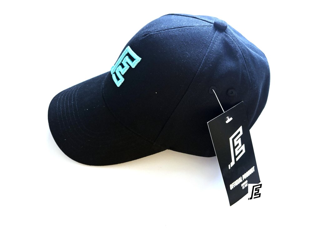 Schwarze 5-Panel-Cap mit gesticktem E-Logo vorne und seitlichem VeVaru-Schriftzug.
