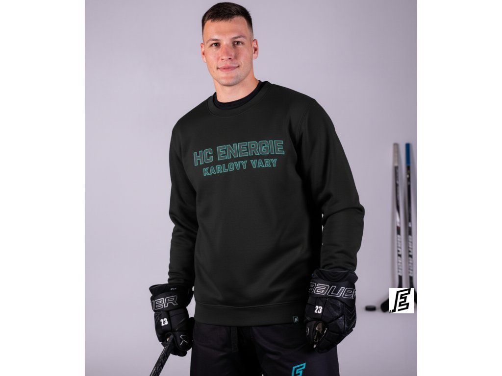 Pánská mikina Víťa v černé barvě s tyrkysovým nápisem HC ENERGIE KARLOVY VARY na hrudi. Pohodlný klubový kousek pojmenovaný po Vítu Jiskrovi.