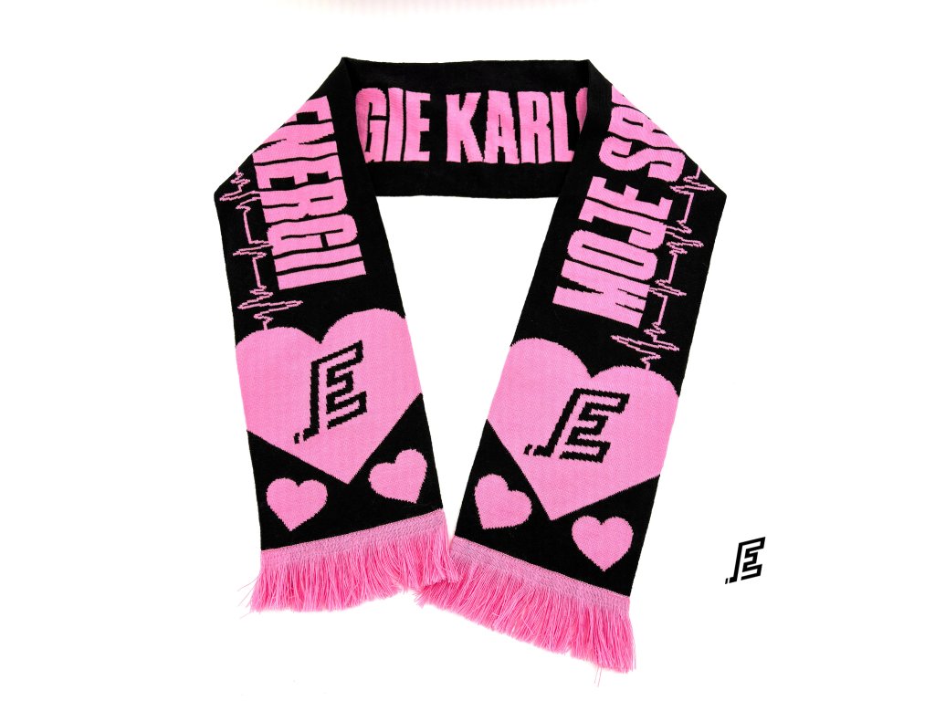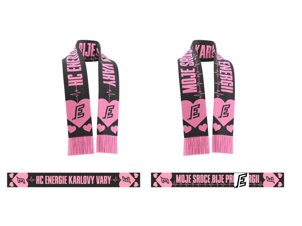 Stylová oboustranná šála v černo-růžovém provedení s nápisem Moje srdce bije pro Energii na jedné straně, HC Energie Karlovy Vary na straně druhé s motivem srdce.