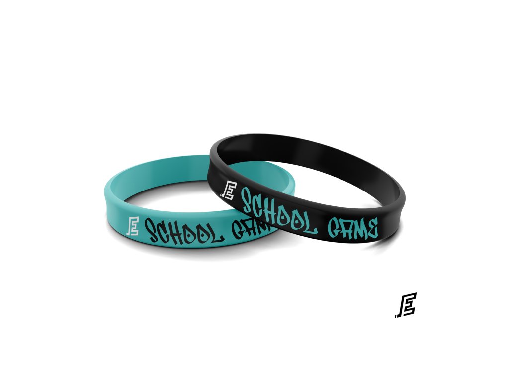 Stylový silikonový náramek dvou variantách – černá a tyrkysová. Každá barva s originálním motivem School Game.