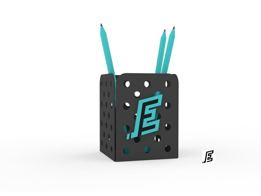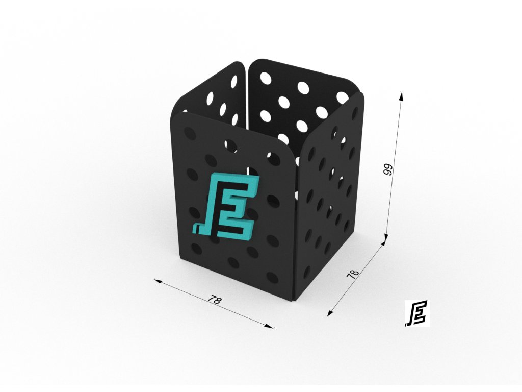 Plechový stojánek na tužky s vyřezávaným logem E v tyrkysové barvě. Stylový a odolný doplněk na stůl pro každého fanouška.
