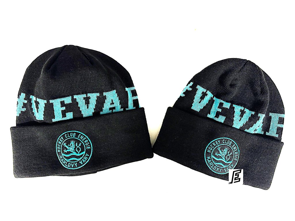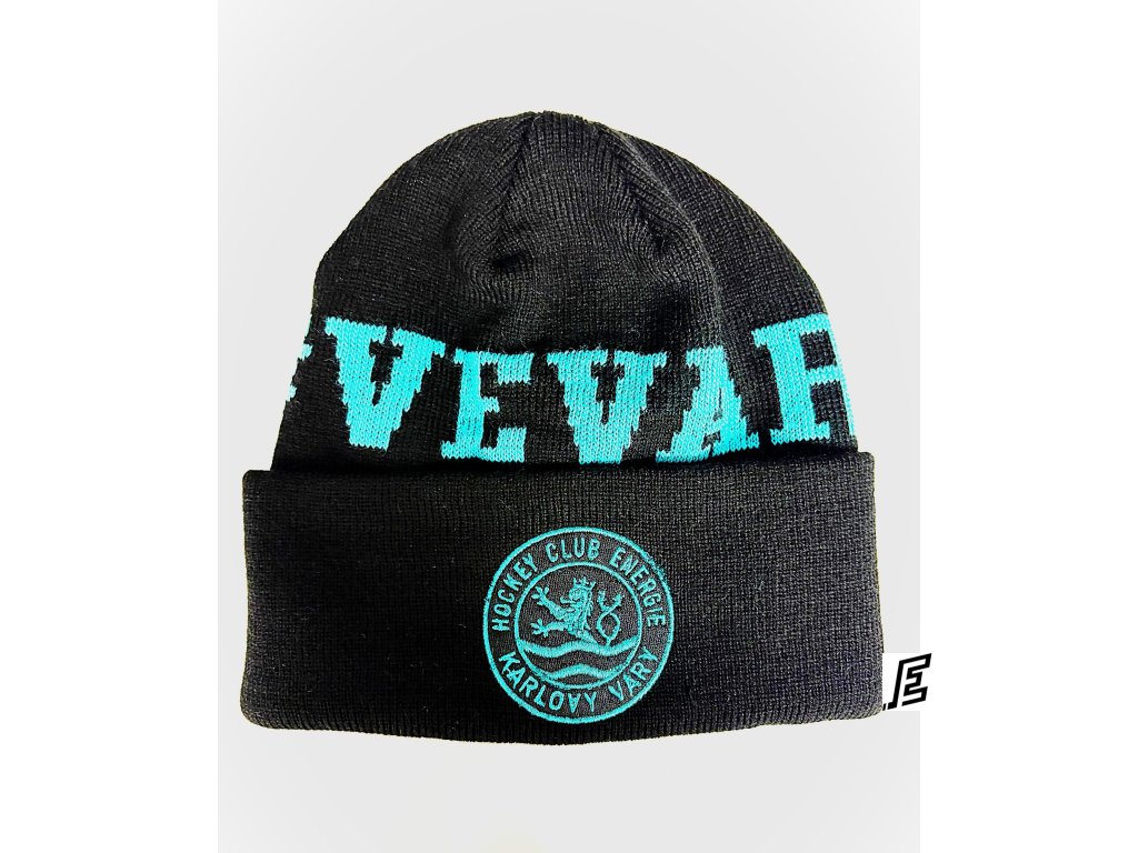 Černá zimní čepice Luko s vypleteným nápisem #VeVaru a klubovým znakem HC Energie. Hřejivý doplněk pro všechny fanoušky. Materiál: 100% polyacryl, vyrobeno v EU.